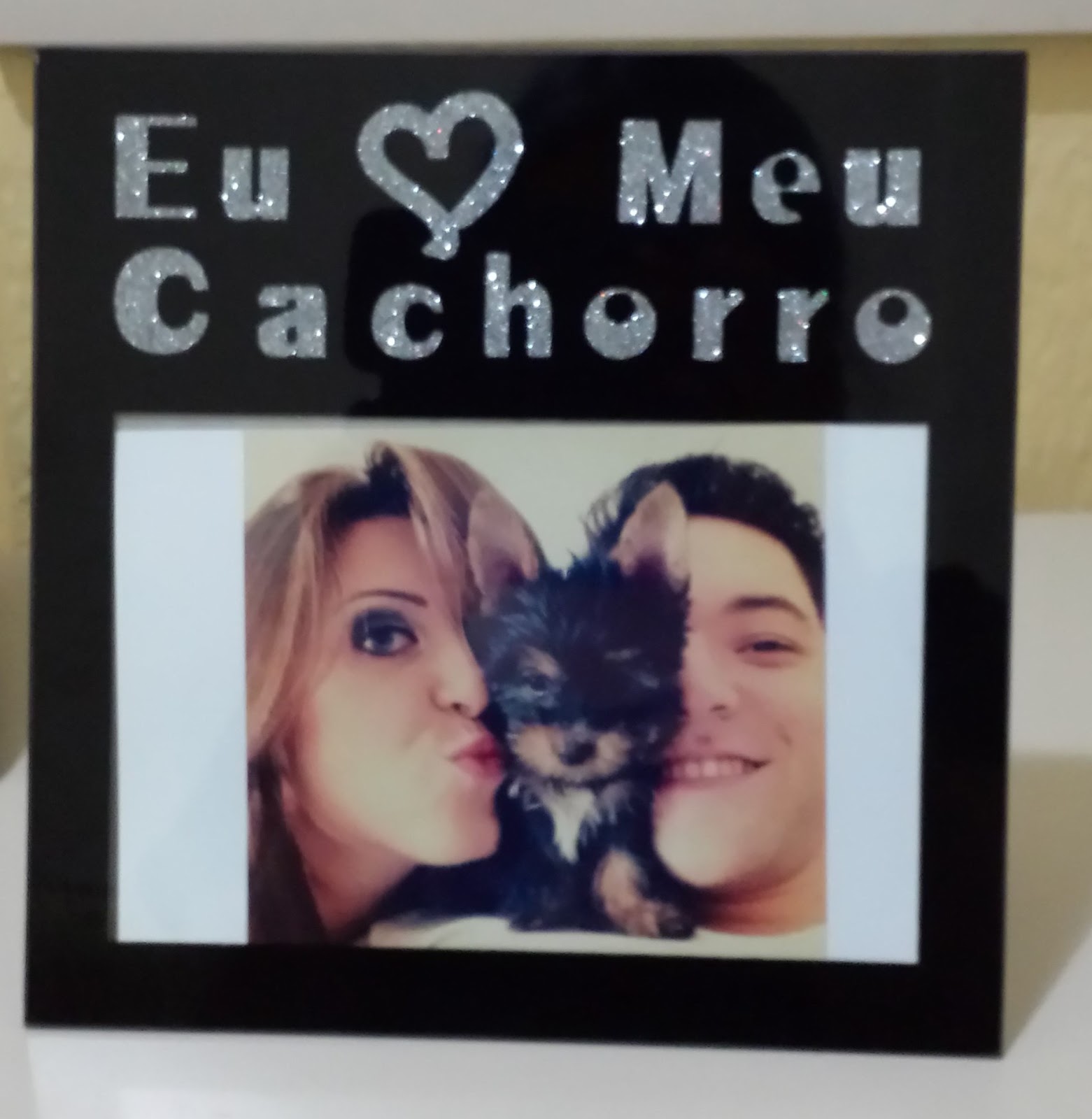 Observando o porta-retratos e com a blusinha no colo.
