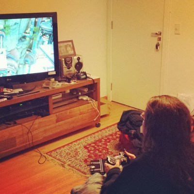 Depois de chegarem em casa, Aoshi continuou sofrendo trabalhando (cheguem logo, férias!) e Selênia foi jogar um pouco de vídeo-game.